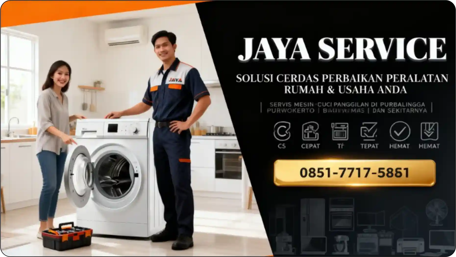 โฐ Layanan 08:00 – 20:00 WIB โข JAYA SERVICE โ Teknisi Mesin Cuci Nomor 1 di Purbalingga, Purwokerto, Banyumas, Cilacap, Banjarnegara, Kebumen, Pemalang & Sekitarnya